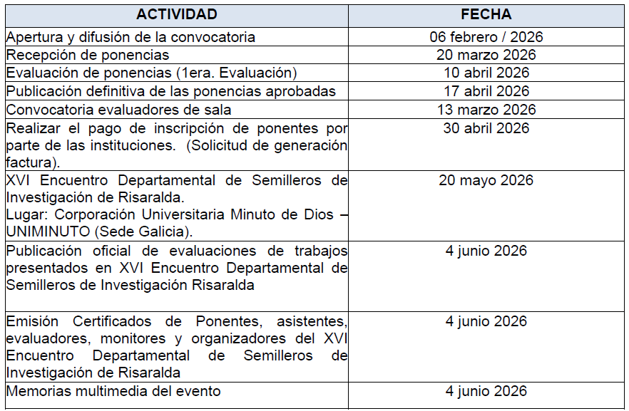 El XVI Encuentro Departamental de Semilleros de Investigación de Risaralda se realizará en modalidad presencial el 20 de Mayo del 2026 en la Corporación Universitaria Minuto de Dios – UNIMINUTO Sede Galicia.